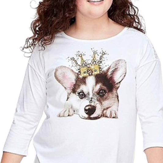 JUSTICE GIRLS 14/16 PLUS White 3/4 Long Sleeve Lace Tee Dog with Crown NEW