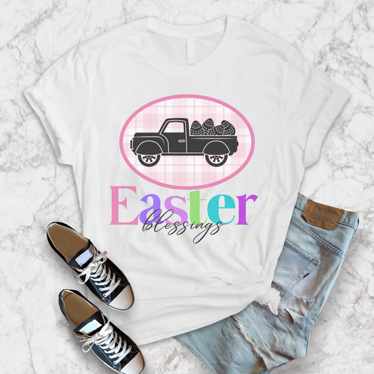 Easter Blessings Pickup Truck with Decorated Eggs Gingham Unisex Jersey Short Sleeve Tee Small-3XL