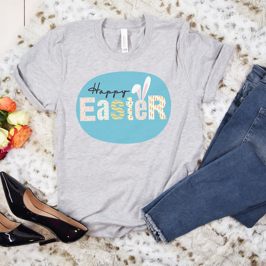 Happy Easter Decorated Letters with Bunny Ears Spring Unisex Jersey Short Sleeve Tee Small-3XL