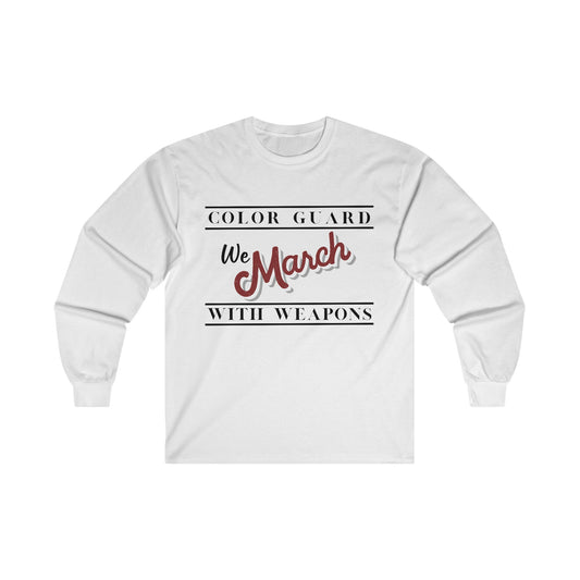 Marching Band Color Guard We March with Weapons Flag, Rifle, Saber Unisex Ultra Cotton Long Sleeve Tee White or Ash