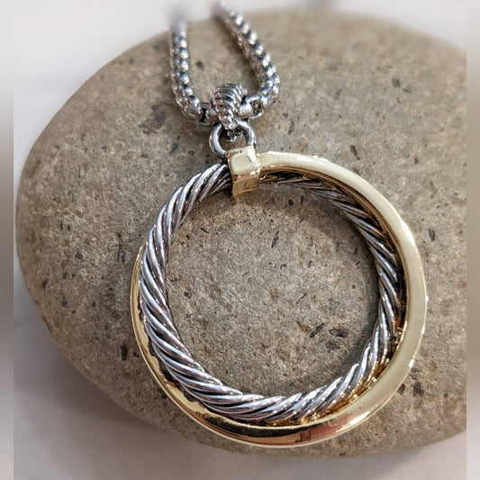 GOLD SILVER Two Tone Sparkle Twisted Rope Circle Pendant Necklace