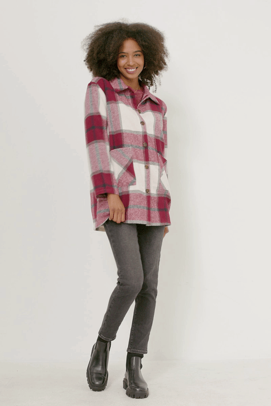 Mandy Misses Burgundy Plaid Shacket with Front Pockets S-L