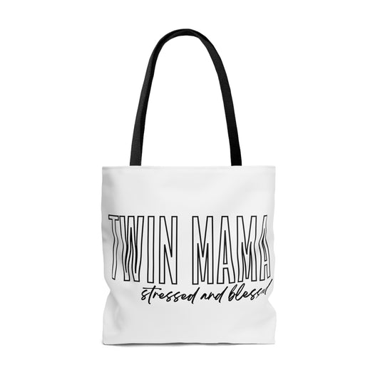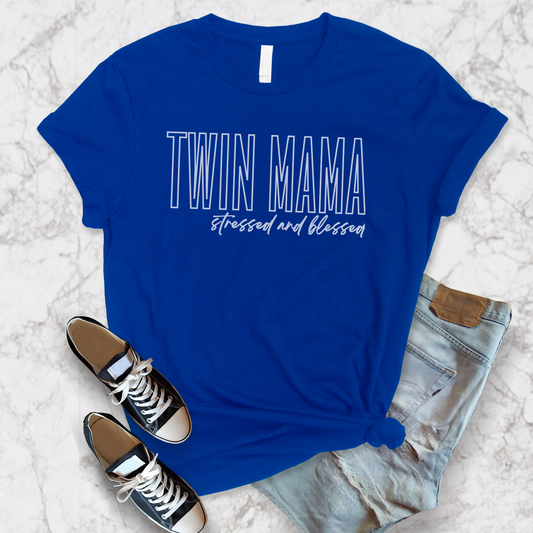 Twin Mama Stressed and Blessed White Block Hollow Letters Paint Style Script Unisex Jersey Short Sleeve Tee Small-3XL Mother of Multiples