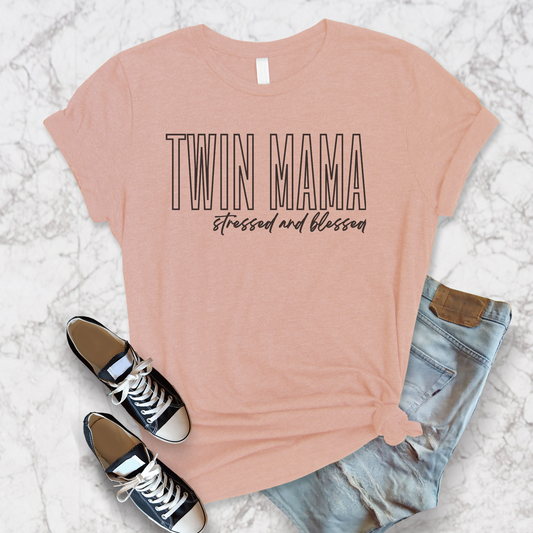 Twin Mama Stressed and Blessed Black Block Hollow Letters Paint Style Script Unisex Jersey Short Sleeve Tee Small-3XL Mother of Multiples