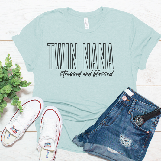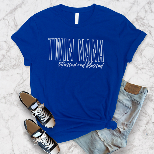 Twin Nana Stressed and Blessed White Block Hollow Letters Paint Style Script Unisex Jersey Short Sleeve Tee Small-3XL Multiples