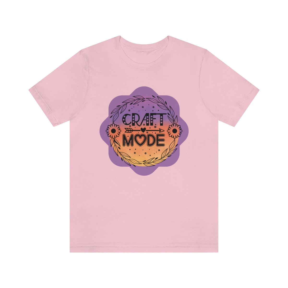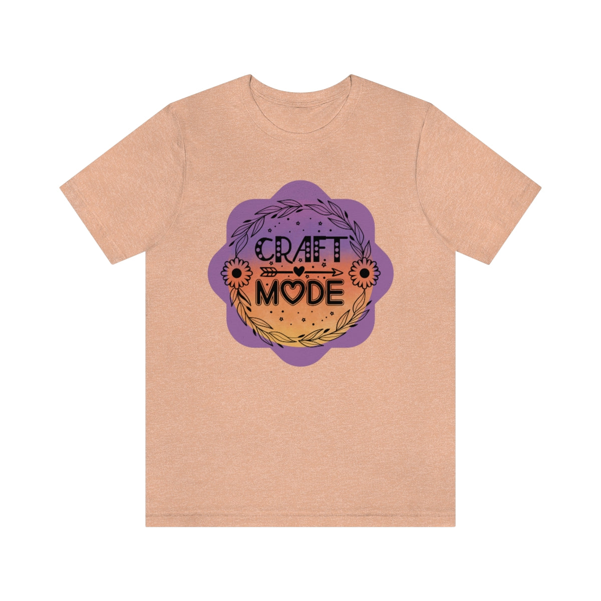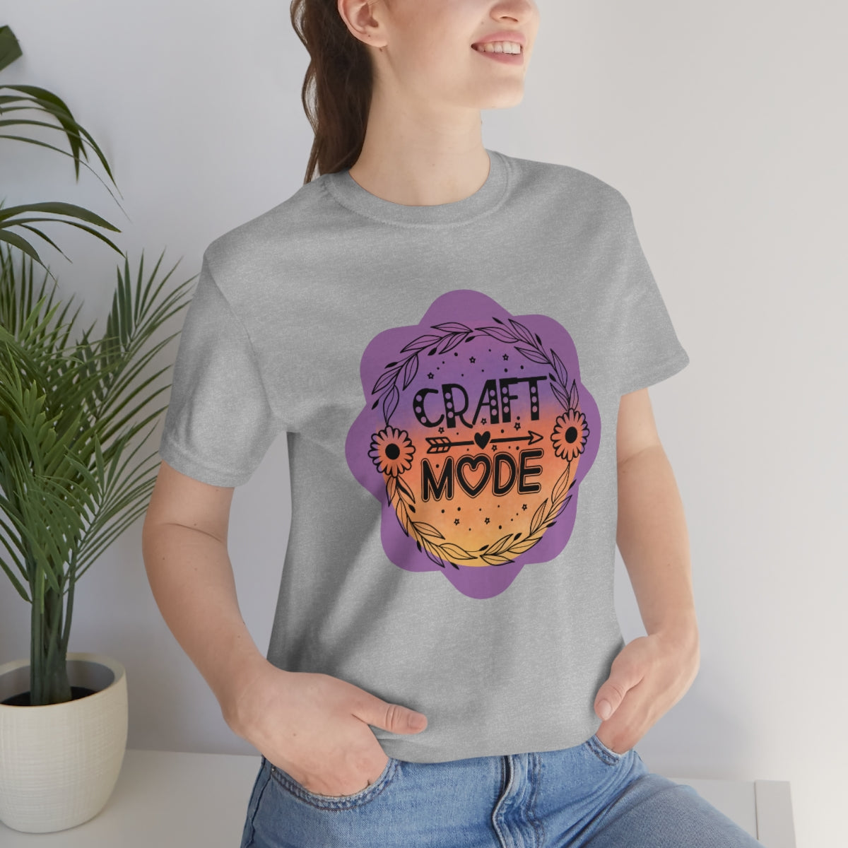 This fun tee is ready for a full weekend of crafting! Whether you are an avid scrapbooker, a handmade jeweler, or painter, this shirt is ready to join you while you create! Purple flower frames a beautiful ombre background with doodle design Craft Mode.