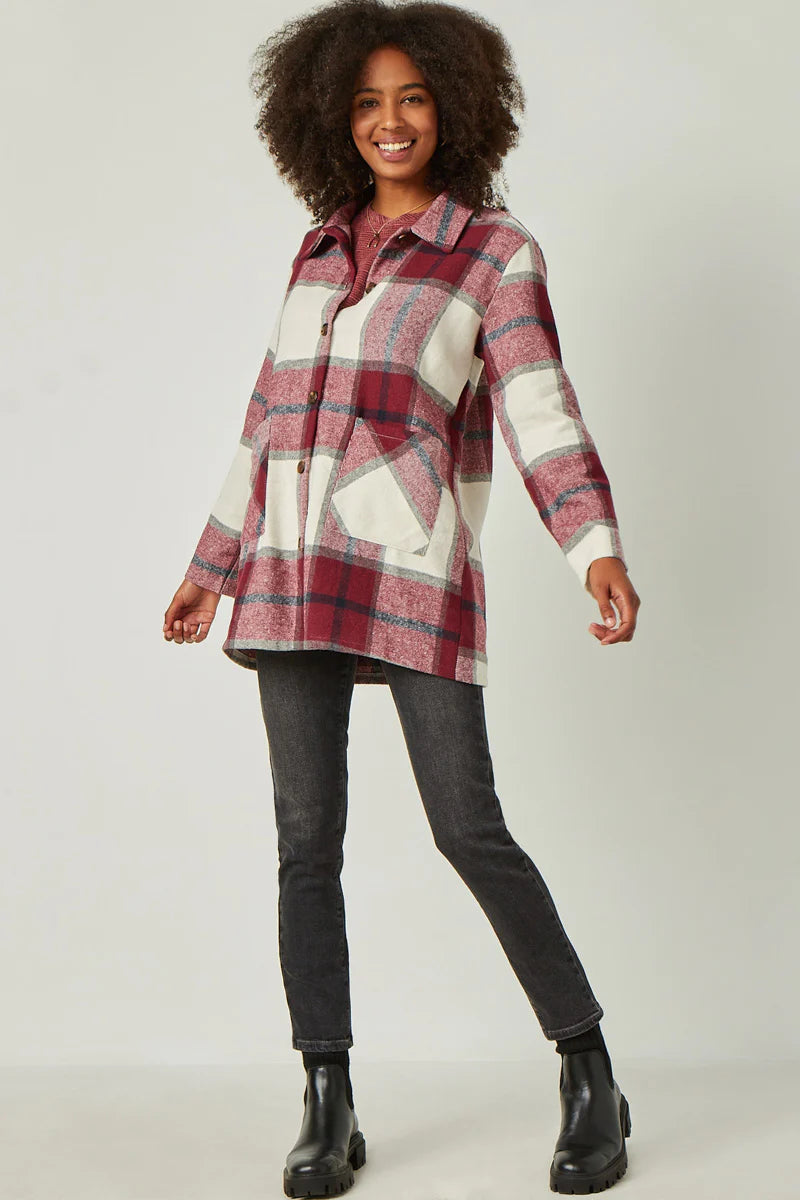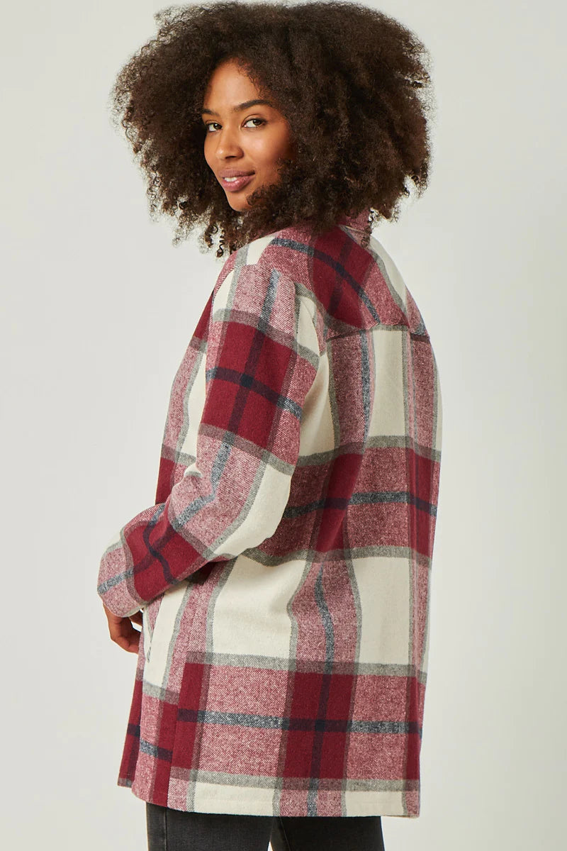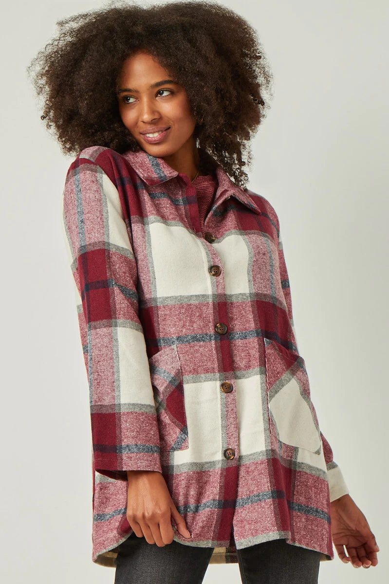 Mandy Misses Burgundy Plaid Shacket with Front Pockets S-L