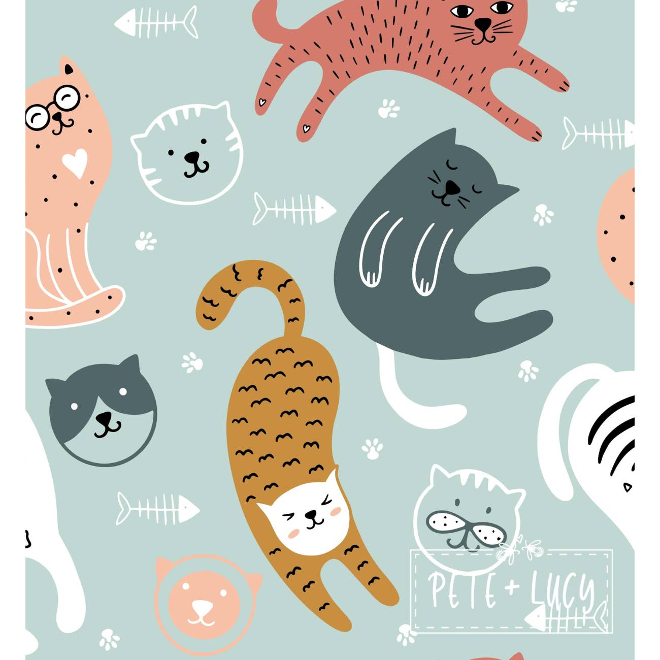 Features a whimsical cat theme hand drawn inspired kitties with cute silly faces and fun prints!