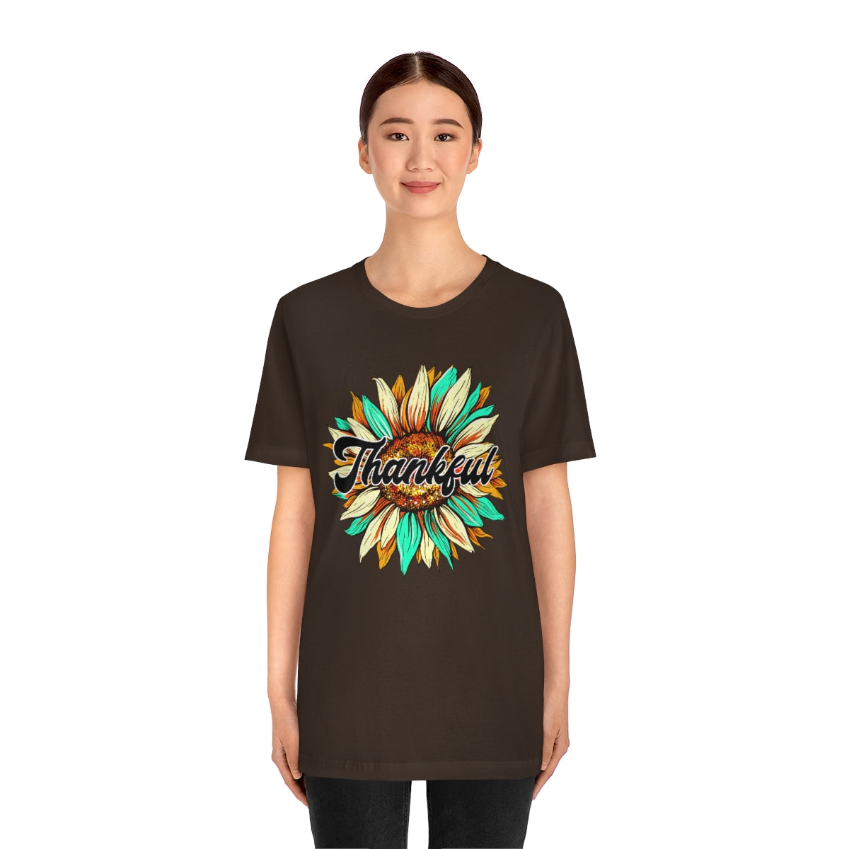 Fall is a great season for giving thanks. Proudly wear this whimsical western-inspired sunflower with script Thankful across it. Sunflower is cream, tan and brown with a pop of turquoise.