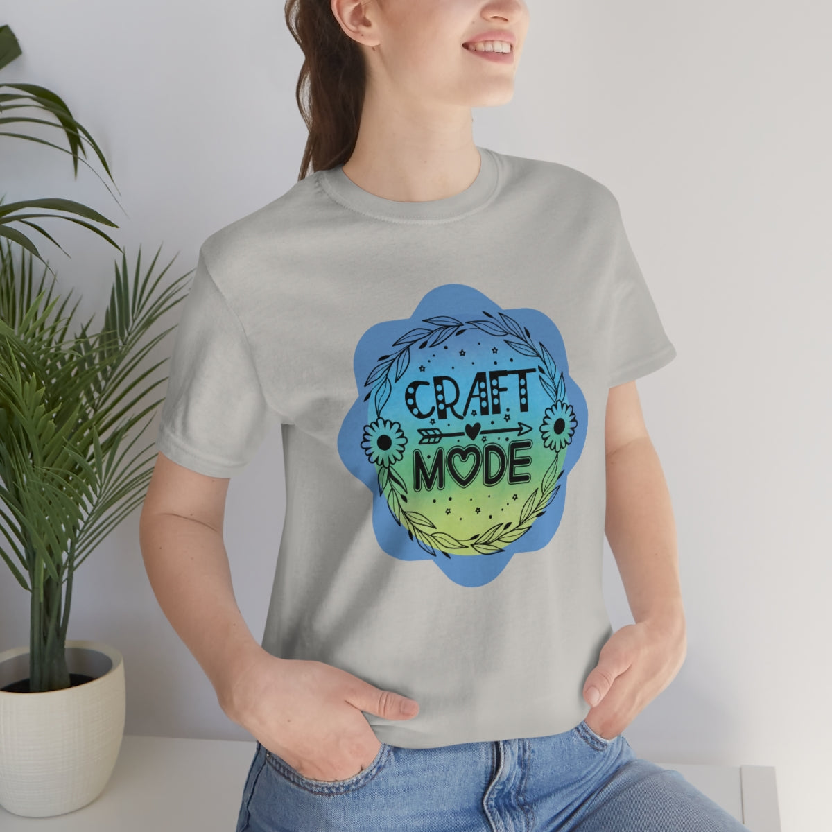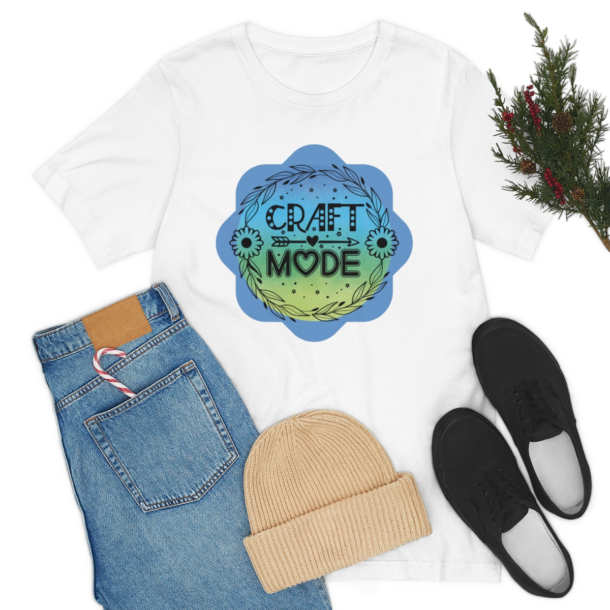 This fun tee is ready for a full weekend of crafting! Whether you are an avid scrapbooker, a handmade jeweler, or painter, this shirt is ready to join you while you create! Light blue flower frames a beautiful ombre background with doodle design Craft Mode.